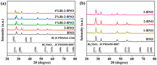 The XRD patterns of the prepared BNO, 1-BNO, 2-BNO and 3-BNO are shown in Figure 4a. The diffraction peaks of all samples could be well indexed as Bi3NbO7 crystalline phases (JCPDS PDF No.50-50078). Five typical diffraction peaks at 2θ = 28.16, 32.74, 46.73, 55.60 and 58.27°, were assigned to the (1 1 1), (200), (220), (311) and (222) planes, respectively. It is evident that pristine Bi3NbO7 was successfully synthesized in the presence of urea, and no other impurity peak appeared. As shown in Figure 4b, Bi displayed unique peaks at 2θ of 27.16, 37.95 and 39.62°, attributed to the planes (102), (104) and (110), respectively, according to the JCPDS Card No. 44-1246 [14]. The diffraction peaks of 1% Bi-2-BNO, 2% Bi-2-BNO and 4% Bi-2-BNO could be indexed as Bi and Bi3NbO7, indicating that Bi nanodots were successfully introduced in the pore-defective Bi3NbO7.