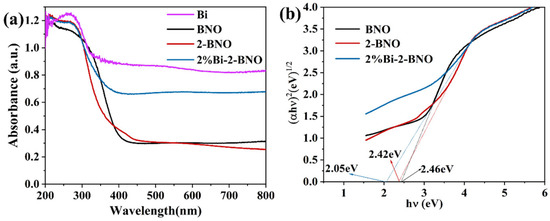 The optical properties of the samples were compared as shown in Figure 5a. The Bi nanoparticles-containing sample exhibited the highest optical absorption compared with the others. It was seen that the absorption edge of the 2-BNO sample showed a slight red shift compared with that of BNO, implying that the promotion of light absorption by the porous defects was small. In comparison with 2-BNO, an obvious increase of light absorption was achieved by the 2% Bi-2-BNO sample in the range of 300~800 nm, indicating that the presence of Bi nanoparticles was beneficial to the light absorption capacity of the pore-defective Bi3NbO7. Moreover, the formula was used to estimate the band gap energy, where α is the absorption coefficient close to the absorption edge, h is the Planck constant, A is a constant, and Eg is the band gap energy (Figure 5b) [27]. The band gaps of BNO, 2-BNO and 2% Bi-2-BNO were calculated and shown to be 2.46, 2.42 and 2.05 eV, respectively. This decreasing band gap tendency for the samples was caused by alterations in the electrical structure due to the combination of the pore defects and the SPR effect of Bi, which could facilitate visible light photoactivity.