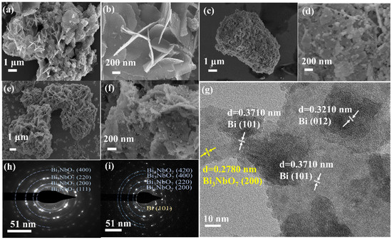 SEM images of (a,b) BNO, (c,d) 2-BNO and (e,f) 2% Bi-2-BNO; TEM images of 2% Bi-2-BNO nanosheets (g); SAED images of BNO (h) and 2% Bi-2-BNO (i).