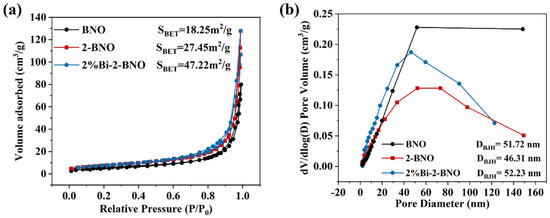 The nitrogen adsorption–desorption isotherms of the samples were type IV with typical hysteresis loops, as shown in Figure 7a. The hysteresis loops were of the H3 type at the relative pressure of 0.5~1.0 P/P0, which is characteristic of nanosheet materials. Among all samples, 2% Bi-2-BNO had the highest specific surface area (SBET), 47.22 m2 g−1, which facilitated NO adsorption on its surface. The SBET values of the BNO and 2-BNO composites were found to be 18.24, and 27.45 m2 g−1, respectively. After the addition of urea and the insertion of Bi nanodots, the SBET increased significantly, which was caused by increased surface roughness and the appearance of porous defects and a loose structure. As can be seen from the pore size distribution curves in Figure 7b, these samples contained mesopores (2–50 nm) and macropores (>50 nm). We inferred that the 2-BNO photocatalyst had higher photocatalytic activity than the nonporous BNO nanosheets due to its significantly porous structure. Moreover, the photocatalytic activity of 2% Bi-2-BNO was higher than that of 2-BNO, resulting from the more active sites provided by the SPR effect due to the Bi nanoparticles.