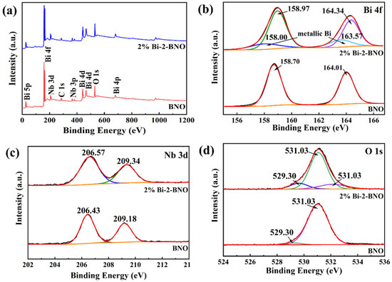 XPS analysis of the BNO and 2% Bi-2-BNO samples: (a) survey spectra, (b) Bi 4f, (c) Nb 3d and (d) O 1s.