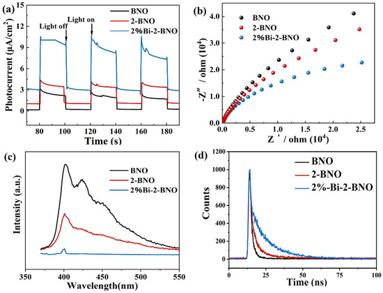 The transient photocurrent responses for electrodes coated with BNO, 2-BNO and 2% Bi-2-BNO under visible light irradiation were investigated to better understand the behavior of photoinduced charges (Figure 9a). The corresponding pattern for 2-BNO appeared obviously at higher responses compared with that of BNO, indicating that the porous defects could improve the separation efficiency of the photogenerated electron-hole pairs. Furthermore, the photocurrent response of the 2% Bi-2-BNO sample was much higher than those of the others, as expected. The results suggest that the Bi SPR effect accelerated the migration of the charge carriers at the zero-dimensional/two-dimensional interfaces, which was highly favorable to charge separation, resulting in a better photocatalytic performance. The EIS Nyquist plots are shown in Figure 9b. The arc radius of BNO, 2-BNO and 2% Bi-2-BNO decreased sequentially, implying that the charge transfer resistance also decreased in a similar manner.