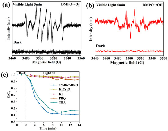 Electron paramagnetic resonance (EPR) measurements were carried out to detect the reactive oxygen species during photocatalysis. As shown in Figure 10a,b, no EPR signal was observed in the dark, but the superoxide radical (•O2−) and the hydroxyl radical (•OH) signals appeared after 5 min of light irradiation for the 2% Bi-2-BNO sample [35,36], indicating that both reactive oxygen species played a key role throughout the photocatalytic elimination of NO over the aforementioned photocatalyst. To further justify the results of the EPR analysis and the effectiveness of the mentioned primary active ingredients during the photocatalytic pathway, trapping tests were conducted for 2% Bi-2-BNO. PBQ, TBA, K2Cr2O7 and KI were chosen to trap •O2−, •OH, e− and h+, respectively. According to Figure 10c, the addition of PBQ, K2Cr2O7 and KI clearly retarded the NO conversion, demonstrating that the photocatalytic conversion mechanism depended predominantly on •O2−, e− and h+. However, when TBA was used, the NO removal efficiency did not obviously decrease, suggesting that •OH rarely participated in the photocatalytic NO removal process.