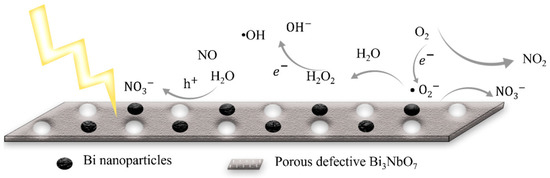 According to the abovementioned findings, a plausible mechanism for the photocatalytic NO removal using 2% Bi-2-BNO is as follow: