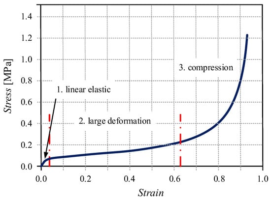 Figure 2 shows the stress-strain diagram of an EPS foam. It can be seen that the curve can be divided into three parts: the linearly elastic section, the large deformation section, where the stress value is almost constant with increasing deformation, and the compression section, where a rapid exponential increase of stress can be observed with small deformation. When a foam is compressed, the walls of the bubbles begin to bend, leading to a linear elastic deformation; beyond a critical deformation value, these bubbles collapse due to elastic buckling every time opposite bubble walls come into contact. As the balls close up, the structure begins to thicken, thereby increasing the stiffness of the material rapidly. To determine this curve, a compression test is required.