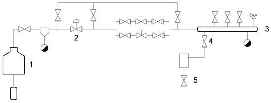 For the production, the Certuss electric steam generator—number 1—was used, which produces a maximum of 10 barg of saturated water steam. It was necessary to reduce this to the desired pressure with a pneumatic control valve number 2. During production, this was around 2 barg. The mass flow of steam was further reduced with the valves located on steam header (number 3). By opening valve number 4, steam is introduced into the molding chamber as shown in Figure 4.
