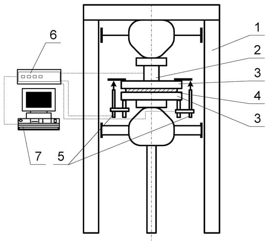 Pressing test set up. 1—pressing machine, 2—force measuring cell, 3—clamping structure, 4—tested specimen, 5—displacement transmitter, 6—Quantum X A/D measurement data collector, 7—computer.