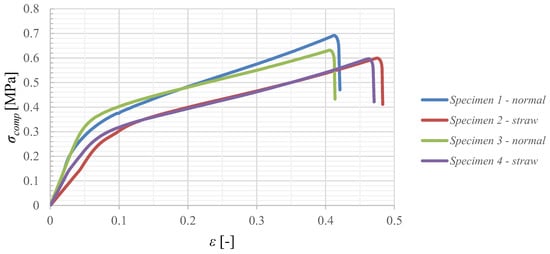 Furthermore, tests were carried out with unstiffened specimens of higher density (Figure 11). In all cases, the sample with higher density had significantly better strength characteristics than the sample with lower density, but its mass was greater. Presumably, due to the smaller air volume, its thermal properties change in an unfavorable direction in terms of insulation.