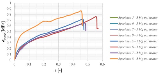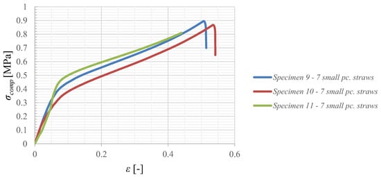 It is clear from Figure 9 that the compressive strength of the polystyrene specimens reinforced with straw is lower than the values of the unreinforced specimens.