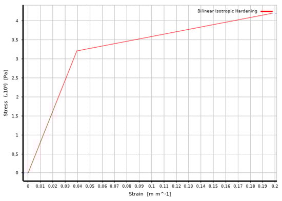 According to the measurements, the bilinear isotropic material model has been chosen for the numerical simulations. With this material model, the numerical results produced practically the same results as those obtained from the experiments. This bilinear isotropic hardening process was defined with three material properties, with the Young’s modulus, the yield strength and tangent modulus. The theoretical behavior of such a material is shown in Figure 14.