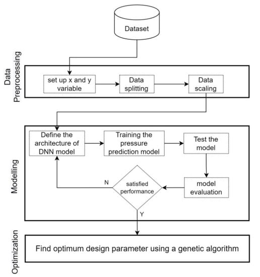 This study involves AI applications for small axial flow fans design by combining the DNN and a genetic algorithm. The DNN technique is used to build the fan modeling. The genetic algorithm is then used to find the optimum fan parameters values. This study used the Python programming language using Anaconda distribution. Several libraries also included scikit-learn, Keras, TensorFlow, and DEAP. Figure 1 shows an overview of the proposed approach. There are three main steps: data preprocessing, pressure prediction model, and design parameter optimization.