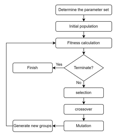 The genetic algorithm (GA) is an evolution method developed from elimination and evolution in nature, and is also known as a hereditary algorithm. It was proposed by Dr. J. Holland in 1975 and evolved from the “survival of the fittest, elimination of the unfit” ethics in the evolutionary process of organisms. The fitness is calculated by random sampling and then the optimum value is calculated by crossover and mutation. This is generally used in the domains of machine learning, optimal combination, and signal processing. The GA is like a natural selection mechanism, where one chromosome imitates biological mating and mutation, and the objective of chromosomes is determined according to their fitness, to achieve optimization, as illustrated by the GA flow chart in Figure 3 [34,35,36,37].