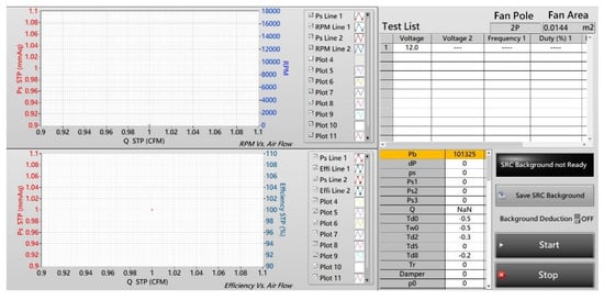 To avoid air leakage, seal the test unit tightly with tape, as shown in Figure 6. After the installation, open the test software, set the test parameters, and confirm whether the parameter values are correct, as shown in Figure 7. After the test is completed, the software will automatically output an Excel report. The P-Q Curve of each fan will be obtained based on an Excel report. The outputs are used for the subsequent study of deep learning and genetic algorithms.