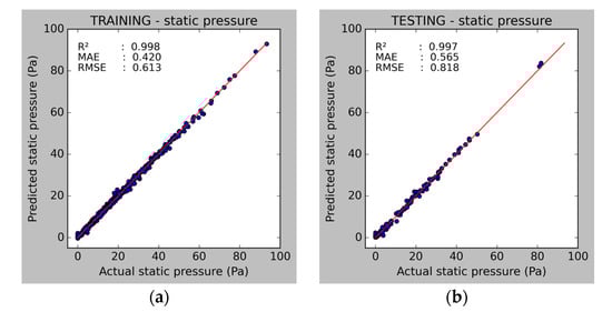 Two prediction models were built with the DNN model architecture: the flowrate model and the static pressure model. The dropout rate 0.01 is added to avoid overfitting after the first, second, third, and fourth hidden layers. The ReLU was selected as the activation function. The epochs were set as 1000, the batch was set as 32, the optimizer was adam, and the loss function was MSE. Figure 8 shows a scatterplot between the actual flowrate and the flowrate model output using (a) training data and (b) testing data. Figure 9 shows a scatterplot between the actual static pressure and the static pressure model output using (a) training data and (b) testing data. From Figure 8 and Figure 9, both flowrate and static pressure can be successfully predicted. Both models are evaluated using R2, MAE, and RMSE, as shown in Table 6.