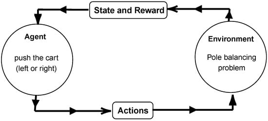 With the return of interest in artificial intelligence (e.g., with the work of Rumelhart et al. [] as a landmark), classic RL problems began to be studied again. For example, the pole balancing problem (a benchmark optimal control problem) provided RL-based alternatives to black-box models obtained from neural networks and tabular algorithms. Figure 2 outlines this learning problem, where an agent must keep the pole balanced (when pushing the cart to the right or left) for a defined length of time of the simulation (T), being formulated as a stochastic sequential decision-making problem (more details are given in Section 2.1), in which the optimal policy must maximize the reward sum, known as the return , along the trajectory , as shown in Equation (1). In this equation, corresponds to the discount factor of the return. When , the immediate reward () is prioritized, whereas if , the entire trajectory is considered [,,].