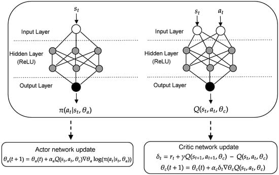 The most-employed deep reinforcement learning algorithm in the literature is the actor–critic networks. This is an algorithm that combines ideas from value-based and policy-based algorithms. First, it was described in LeCun et al. []. Then, Sutton et al. [] effectively formulated it for RL, with the guarantee of convergence given by the deterministic policy gradient theorem. Figure 3 illustrates the update of the actor and critic networks. Specifically, the step forward comprises the action selection () and the critic network computation (i.e., value function ). In the backward step, the parameters of both networks are updated with the backpropagation and stochastic gradient descent algorithms. At this point, it is worth mentioning that it is necessary to calculate since the actor network categorizes actions instead of their value, as suggested by Williams [] and shown in Equation (10). Furthermore, the temporal difference (TD) method is recommended to learn offline directly from experience (i.e., TD-error ()). As the method does not require a model of the environment, it is straightforward to implement and allows bootstrapping, which is an advantage compared to Monte Carlo (MC) methods and dynamic programming. However, its training must be rigorously performed to avoid obtaining unfeasible policies, since the computed Q-value does not consider the return from the entire trajectory as in MC methods [].