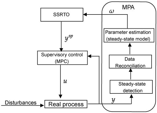 In this review, SSRTO is the only RTO application addressed for three reasons: (1) it remains the most-applied approach in the process industry; (2) it has an extensive literature; (3) to the best of the authors’ knowledge, only Powell et al. [] used RL in this context. Figure 5 illustrates the steps of SSRTO with model parameter adaptation (MPA). Specifically, MPA updates the rigorous model of the SSRTO layer with steady-state plant information, which must be detected and treated with process data reconciliation before being fed to the parameter estimator. The process disturbances and model uncertainty strongly influence this step. When varying with the same plant dynamics, the former makes it difficult to detect the steady-state. The latter directly affects data reconciliation and parameter estimation. Nevertheless, it is a traditional industry methodology for well-segmented optimization and control steps, facilitating its application and maintenance in the real process. In addition, there are still alternatives to improve parameter estimation by including model and plant derivatives (for more details, see [,,]).