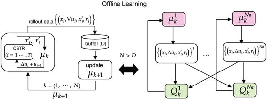 This model-free algorithm depends on offline training, where the learning across different episodes can be: (1) off-policy: the learned policy is updated from data obtained from the implementation of other policies. This learning procedure is shown in Figure 4, where is updated from samples of policy roll-out data up to (i.e., ), which are contained in a large buffer. For example, the deep deterministic policy gradient (DDPG) algorithm [] estimates the Q-values through a greedy policy instead of the behavioral policy, which leads to the TD-error () shown in Equation (11). The second (2) is on-policy: the learned policy is updated from transitions (or data) exclusively taken from the previous policy ; thus, it does not depend on a buffer []. For example, the proximal policy optimization (PPO) algorithm [] estimates the Q-values assuming the current behavioral policy continues to be followed, resulting in the TD-error () shown in Equation (12).