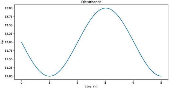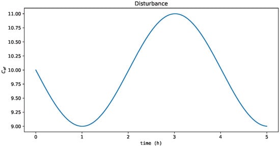 To validate these results, a new process condition not tested offline was performed: the training time was extended to 5 h; the dynamics of process disturbance was a sine wave, which exhibited a smooth, periodic oscillation (Figure 10); the steady-state condition was , and .