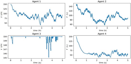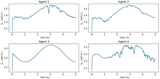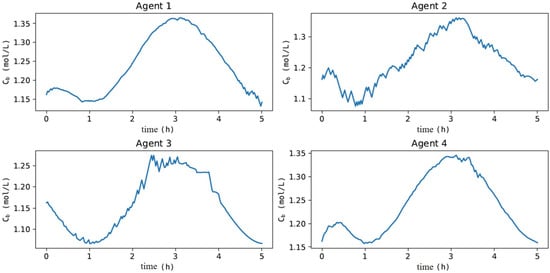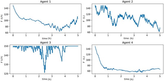 All learning agents showed a more oscillatory behavior, as shown in Figure 15. This was expected as they were not exposed to these conditions in offline training. Despite this, they managed to capture the dynamic behavior of adequately, again with Agents 1 and 4 taking control actions closer to those considered optimal, as shown in Figure 16 (i.e., concerning HRTO (Figure 17)) and with a CPU time equal to the condition tested before and summarized in Table 3. These results were due to the networks’ ability to generalize to other process conditions, which demonstrated the robustness of the MADDPG controller to adapt to abrupt process changes, as detailed in Spielberg et al. [] for the DDPG controller, without the need to restart the offline training.