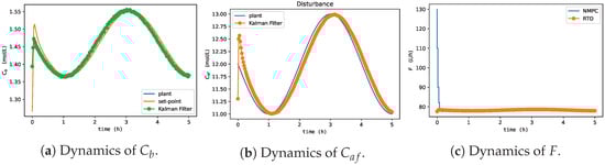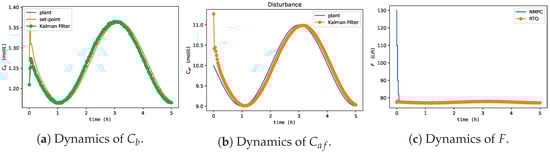 In Figure 11, when evaluating the dynamics of , Agents 1 and 4 had the least-oscillatory behavior, did not exceed the process constraint, and took adequate control actions for process disturbances, as illustrated in Figure 12. These results corroborate what was expected given the oscillatory behavior of Agents 2 and 3 in the offline training phase to update the actor and critic networks. Agent 3 resulted in a sub-optimal actor with saturated control actions at the upper limit of F. Agent 2 did not find a suitable actor to deal with process disturbances, resulting in an oscillatory and divergent control policy. These results denote one of the main features of the MADDPG algorithm (mentioned in []), as it allows using cooperative control agents that have increased learning (Agents 1 and 4) when collecting experiences of sub-optimal policies (Agents 2 and 3). Although Agents 2 and 3 resulted in unfeasible policies, the possibility of using each agent in parallel improved the robustness of the methodology (compared to DDPG), especially considering its implementation in the real process, which could discard Agents 2 and 3 and directly employ Agents 1 and 4 or even combine them. These claims were evaluated by comparing the performance of all agents with respect to the two-layer approach. Specifically, the HRTO approach with the set of parameters based on Matias and Le Roux [] was chosen. Agents 1 and 4 rejected the disturbances and reached the set-point as in HRTO (Figure 13), which employed the extended Kalman filter (EKF) and estimated (online) for the model adaptation step of RTO and MPC. The EKF suitably estimated the disturbance (Figure 13b) so that MPC achieved the set-points resulting from the RTO layer (Figure 13a,c).