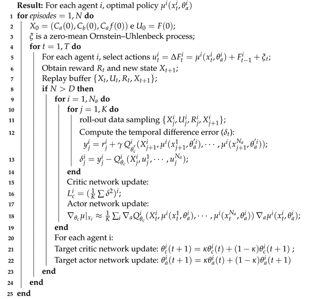 The steps for its implementation are similar to the DDPG algorithm and are shown in Algorithm 1. However, the dimension of the buffer is increased since the critic network update () will also depend on collected experiences, actions , states , state transitions , and rewards , from the other agents. Regarding the case study, the first step is selecting the number of agents (), which directly influences the amount of acquired experience and the computational burden. At each execution of the algorithm (), the initial condition () is sampled at random (uniformly) for each agent and kept constant for . The aim is to expose each agent to various experiences, continuing to learn to maximize rewards () regardless of the initial state ( and ) and process disturbance (). This procedure follows the behavioral policy and the Ornstein–Uhlenbeck process to generate temporally correlated exploration samples (), and thus obtain the rewards (Equation (23)) and reach the new state (Equations (21) and (22)), which compose a buffer that stores and replays uniformly the roll-out data (). With a sufficient number of samples (i.e., if ), the update step for each agent effectively begins. The tuple () of size K is sampled at random (uniformly) to compute the TD-error () increased with actions implemented by each agent, which leads to updating the critic and actor networks. Finally, updating the actor and critic networks with delayed (or filtered) copies of the original DNN is an alternative, as in DDPG algorithms, to stabilize training.