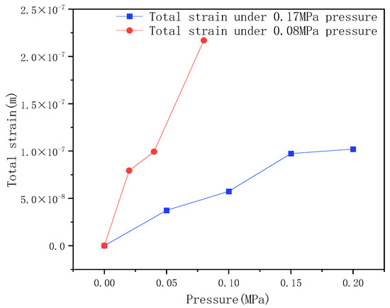 Total deformation curves of molecular sieve beds under 0.08 MPa and 0.17 MPa pressures.