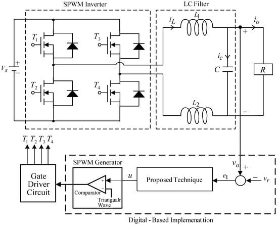 Through the use of the proposed technique, the output voltage of a single-phase SPWM inverter is enforced to match a sine referenced voltage . When and are defined, it is possible to derive the error dynamic state space equation as follows: