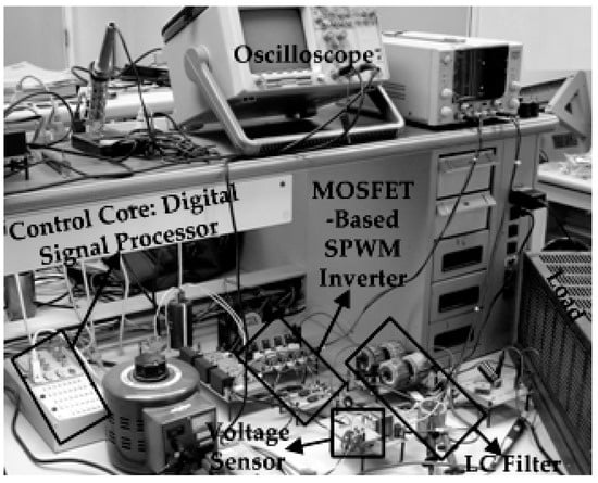 Figure 2 and Figure 3, respectively, depict the simulated output waveforms of the single-phase SPWM inverter with a fully resistive load for the conventional SMC and the proposed technique. As the load is a linear resistive load without dynamic changing, the output voltages of both the conventional and the proposed inverter approach very closely to sine waves. A detailed inspection of the two output-voltage waveforms shows that there are only quite short transient phenomena at the beginning of the waveforms, after which the steady-state reactions remain nearly distortion-free. The simulated output voltage of the single-phase SPWM inverter operated by the conventional SMC under a stepped load (no load to full load) is displayed in Figure 4. With the corresponding load case, Figure 5 depicts the simulated output voltage of the proposed single-phase SPWM inverter. It can be detected from Figure 5 that the proposed single-phase SPWM inverter not only obtains less transient voltage degradation, but also rapidly remedies the voltage drop back to the reference voltage value. While the conventional SMC makes the instantaneous voltage sink to about one hundred voltages and then recover to close to the reference voltage, the proposed technique not only results in a lower voltage drop and shorter recovery time, but also completely brings the voltage to the required sine wave voltage. Figure 6 shows the simulated output voltage of the conventional sliding mode-controlled single-phase SPWM inverter as the filter parameters are varied. Figure 7 plots the simulated output voltages of the proposed single-phase SPWM inverter subject to fluctuations in the filter parameters. The proposed single-phase SPWM inverter exhibits significant insensitivity, having an approximately sinusoidal output voltage, whereas the conventional sliding mode-controlled single-phase SPWM inverter suffers from a high level distortion in the output voltage waveform. The proposed technique features high robustness against changes in internal parameters providing a superior steady state, whereas the conventional SMC easily affects the waveform even with the minor changes in internal parameters, leading to severe distortion and deformation. The proposed algorithm and the SPWM module are designed in MATLAB (version 6.1, MathWorks Inc., Natick, MA, USA)/Simulink (version 4.1, MathWorks Inc., Natick, MA, USA) software. Real Time workshop auto-generates the C code, which is permitted to run on the hardware (dSPACE digital signal processor). The implementation in the hardware is depicted in Figure 8, which illustrates the inference circuit between the digital signal processor as well as the single-phase SPWM inverter. There are four optocouplers (PC923) taken to provide the isolation among the control as well as the power circuits. The power MOSFET used is the IRF460. The voltage sensor employed is an AD202 isolation amplifier. Figure 9 and Figure 10 show the experimental steady-state output voltages of the single-phase SPWM inverter using the conventional SMC and proposed technique at full resistive loads. Both output voltages have good regulation with low harmonic distorted AC waveform. Because the load is linear without any variation or non-linearity, pure sine waveforms can be obtained with either the conventional SMC or the proposed technique. The experimental waveform achieved with the conventional SMC, under a stepped load from no load to full load at a 90 degree firing angle presented in Figure 11, contains a major voltage droop with a delayed restoration period. When a conventional SMC inverter is operated during no load condition, the output voltage maintains a good sinusoidal steady state. Once it suddenly becomes full-load operation, the output voltage drops to nearly one hundred voltages and cannot quickly return to the required sine wave output-voltage amplitude during the transient conversion. Conversely, Figure 12 reveals the experimental waveform acquired using the proposed technique under a stepped load of 90 degree ignition angle from no load to full load. A satisfactory transient can be observed along with a little voltage droop after which the voltage waveform comes back to a good level of steady-state precision. The proposed technique uses a non-linear sliding function and GMM predictive compensation, resulting in minor output voltage drop along with a faster recovery to one hundred and ten voltages (root-mean-square value). For a single-phase SPWM inverter with a resistance of 12 ohms, the values of the LC filter parameters are supposed to be between 50% and 100% of the nominal value. Figure 13 and Figure 14 display the experimental output voltage waveforms of a single-phase SPWM inverter which is separately managed by the conventional SMC and proposed technique. The proposed technique is less sensitive to parametric variations as well as loading perturbations as compared to the conventional SMC. The filter of the inverter is the important element for filtering harmonics, which can detect the effectiveness of the designed control method in the case of changing filter parameters. The proposed technique clearly has a good steady-state output behavior for filter parameter variations, while the conventional SMC produces distorted sine wave with high %THD. The proposed technique yields desirable steady-state and dynamic reactions as well as exhibiting noticeable enhancement in terms of decreasing output-voltage distortion subject to filter parametric variations. Table 2 shows the simulated and experimental voltage droop and %THD. In the final conclusion, the voltage THD needs to be less than 5% as recommended by the IEEE standard 519-1992. In addition, according to the recommendation of Institute of Electrical and Electronics Engineers (IEEE) standard 1159-1995, the voltage drop should be the reduction in root-mean-square voltage/current at the source frequency from 0.5 cycles to one minute period; normal values of volt