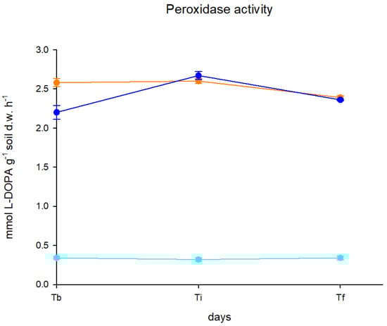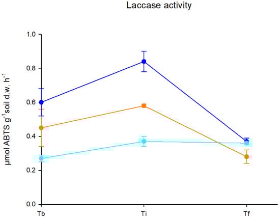 Two-way RM ANOVAs showed significant differences in enzymatic activities among soil types (Table 1), notwithstanding the similar temporal dynamics (Figure 1), with an increase of both laccase and peroxidase at Ti, in respect to Tb, in all the soils. While laccase activity decreased at the end of the incubation (Te) in N1 and N2 soils, it remained constant in I soil. At the end of the incubation, laccase activity tended to reach the same value in all the soils, with a significant difference only between N1 and I (Table 1). Peroxidase activity showed a different trend: it increased in natural soils at Ti and then decreased at Te, while it decreased in I soil at Ti and increased at Te.
