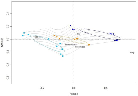 The MANOVA highlighted significant differences among soils from different sampling areas (F = 165, p < 0.001) and sampling times (F = 23, p < 0.001), as well as for their interactions (F = 17, p < 0.001). The NMDS, with the superimposition of confidence ellipses for the sampling areas and the temporal gradient (Figure 2), showed a clear separation of the three soils, with the industrial one mainly affected by the bacteria group. The two natural soils, near each other, also differed in microbial communities, being those of N1 richest in actinomycetes and mycorrhizae. In terms of total microbial biomass, natural soils registered at the beginning of the incubation higher values in respect to the industrial soil, with means of about 97 mol% in N1, 148 mol% in N2, and 59 mol% in I soil (Table 2). The microbial biomass decreased with time in all the soils, mainly in relation to the decrease in actinomycetes and mycorrhizae groups observed in Figure 2.