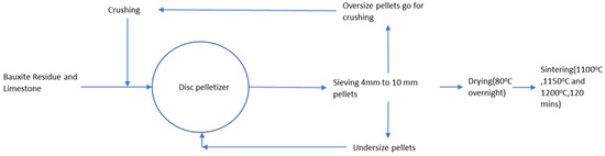 The two raw material powders were mixed in three different CaO/Al2O3 ratios equal to 0.85, 1.0, and 1.15 (called hereafter C0.85A, C1A, and C1.15A, respectively) in a ball milling machine at 30 revolutions per minute (rpm) for 90 min to do both mixing and deagglomerate possible remained large BR or limestone clusters. The mixing ratio selection was based on the chemical composition of the two materials and maintained the formation of leachable calcium aluminates in the pellets. Green pellets were produced using a disk pelletizer via water addition. The pelletizing disk speed was 26 ± 2 rotations per minute (rpm) with the disk volume capacity around 130 dm3, and the disc angle was 45 degrees, as experienced to be the optimum angle. The size of the produced green pellets was 4–10 mm, and the pellets were dried in an oven overnight at 80 °C. The overall flow process of pelletization and further high-temperature sintering is shown in Figure 1.