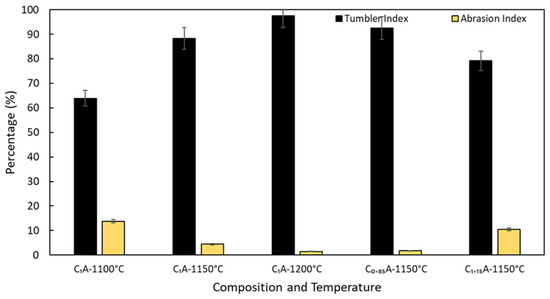 The tumbler index is around 80%, and abrasion index is around 10% for C1.15A-1150 °C sintered pellets. It was found in the literature that a tumble index above 92% and an abrasion index below 6% show quite good strength for iron ore pellets for the Midrex process [21]. For C1A-1100 °C, the tumble index is around 54% and abrasion index is around 14%, which signifies this pellet does not have good strength.