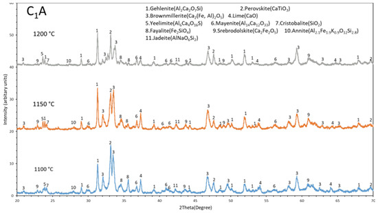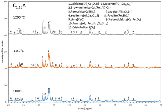 XRD results of three sintered temperatures for pellet C1A are illustrated in Figure 5. It is shown that there are notable phase changes between the sintered pellets and raw materials (Figure 4). Iron is mostly present in the sintered pellets as brownmillerite (Ca2(Fe,Al)2O5), srebrodolskite (Ca2Fe2O5), and fayalite (Fe2SiO4). The main other phases in the sintered pellets are gehlenite (Ca2Al2SiO7), cristobalite (SiO2), perovskite (CaTiO3), lime (CaO), and yeelimite (Al6Ca4O16S). XRD shows some free CaO present in the sintered pellets, while the intensity of free CaO is less for a higher sintering temperature of 1200 °C compared to a lower sintering temperature. The brownmillerite (Ca2(Fe, Al)2O5) phase has the highest amount at 1150 °C sintering temperature.