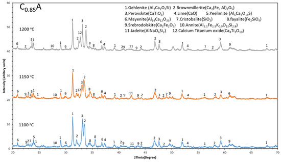 The XRD spectrums for the C1.15A and C0.85A are presented in Figure 6 and Figure 7, respectively. In both mixtures, the identified phases are almost the same, but the main difference is adding a different amount of CaCO3. The perovskite (CaTiO3) peak appears differently. In the lower CaCO3 addition, the perovskite (CaTiO3) peak intensity is stronger at 1100 °C than 1150 °C, while it again becomes stronger at the higher sintering temperature of 1200 °C (Figure 7). However, for the higher CaCO3 addition, the perovskite (CaTiO3) spectrum is stronger at higher temperatures. Iron-containing phases behave similarly at different sintering temperatures in higher and lower CaCO3 ratios. At 1150 °C, sintering temperature iron-containing phases in all three pellets compositions have a higher intensity of peaks as compared to other sintering temperatures.