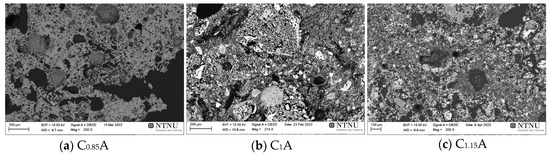 Figure 9 shows that in lower C0.85A, too much sintering occurred at 1150 °C, which results in lower open porosity in the pellets compared to 1100 °C (Figure 8). In C1.15A and C1A samples in Figure 9, the microstructures are more similar. At a higher CaCO3 mixture (C1.15A) the porosity is more visible, which agrees with the above porosity measurements. The SEM backscattered images in Figure 9 show that the produced pellets are not homogeneous regarding the chemical composition.