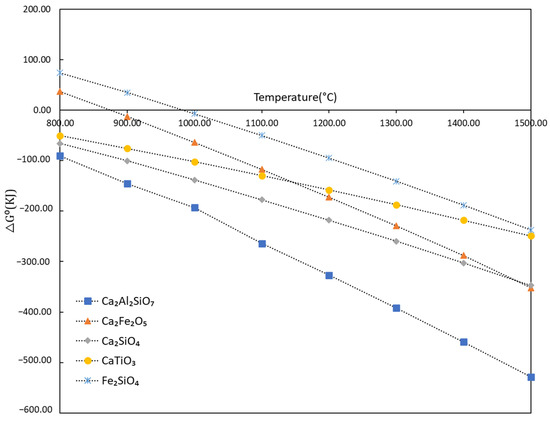 Srebrodolskite (Ca2Fe2O5) is a minor Fe-containing phase in all sintered samples. The standard free energy of formation of this phase decreases with sintering temperature rise as shown in Figure 12. During high temperature sintering, iron oxide in the BR reacts with CaO to form calcium ferrite (Ca2Fe2O5) and calcium aluminoferrite (Ca2(Fe,Al)2O5). The Calcium ferrite phase is known as Srebrodolskite (Ca2Fe2O5). However, in X-ray diffraction and SEM-EDX analysis, it was found that in srebrodolskite small amount of Al is present, which can be the reason for observing the XRD peak is a little bit shifted from the standard peak position. The formation of Ca2Fe2O5 phase may be via Formula (4). Furthermore, the formation of Ca2(Fe,Al)2O5 can be via the contribution of Al2O3 directly in the reaction or via later mass transport of Al to Ca2Fe2O5 through the dissolution of Al2O3 into Ca2Fe2O5 or diffusion through solid/semi-solid phases in material.