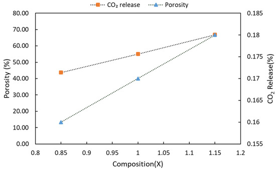 It is found that the CO2 releases from pellets and porosity evolution for the samples show similar trends at constant sintering temperatures for different BR and limestone ratios as shown in Figure 13. As the limestone amount increases, more CO2 leaves out the sample during sintering, resulting in higher porosity. Hence, we may conclude that porosity evolution correlates with the amount of limestone used and further calcite decomposition. Therefore, it is expected that if quicklime (CaO) is used, the porosity is less dependent on CaO addition compared to CaCO3 addition.