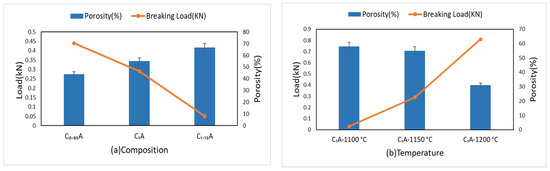 Porosity vs. breaking load of different compositions at fixed sintering temperature 1150 °C (a), and at different temperatures for fixed composition C1A (b).