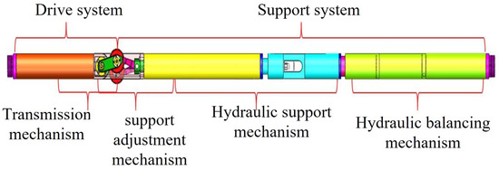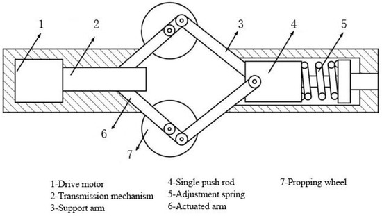 The horizontal well is the main well type in downhole engneeing. The horizontal well technology has become an important technique in oil recovery [1,2,3,4,5]. Downhole operations (such as logging) are usually faced with the challenge of instrument transportation. The downhole tractor can solve the problem of downhole instrument transportation. Commonly used downhole tractors are divided into the wheeled downhole tractor (WDR) and the telescopic downhole tractor. The telescopic downhole tractor provides greater traction, but the speed is slow. On the contrary, the WDR provides small traction and faster speed [6]. In terms of well logging, as time is very tense, the traction instrument for logging is light in weight, and the WDR with high speed is mainly used [7,8,9]. It is simple and fast to use the WDR to transport instruments in the horizontal well [10]. However, at present, the tractive force of the WDR is small, and the requirements for wellbore quality are high. Because the conventional WDR is not suitable for the open hole well, the instrument transportation for the open hole well is faced with major technical probems [11]. The adaptability of the WDR is poor. The WDR moves in the casing pipe. During the use of the casing pipe, defects, such as well wall deposit, casing wear, and casing reduction, are caused on the inner wall [12,13]. Therefore, the propping wheel may move on the irregular inner wall of the casing pipe. If the propping wheel cannot cross through obstacles, the WDR may be seized, affecting normal operations, and even resulting in downhole accidents. Therefore, the industry places higher demands on the obstacle surmounting the performance of the existing WDR [14,15]. The WDR is essentially composed of the transmission mechanism and the support adjustment mechanism. The transmission mechanism drives the propping wheel to rotate. The support adjustment mechanism regulates the radial position of the propping wheel so that the propping wheel contacts with the casing pipe or disengages from the casing pipe. The propping wheel contacts the casing pipe under the action of the support adjust ment mechanism so that the WDR can move forward in the casing pipe. The support adjustment mechanisms of the existing WDR mainly include the piston and rod support adjustment mechanism, the motor and slider support adjustment mechanism, the cam support adjustment mechanism, the skid rod support adjustment mechanism, and the slider and chute support adjustment mechanism. For the piston and rod support adjustment mechanism, it is difficult to adjust the support arm. The WDR with the piston and rod support adjustment mechanism has a poor obstacle surmounting performance. The structure of the motor and slider support adjustment mechanism is simple. The motor and slider support adjustment mechanism only has an adjustment spring. Therefore, the propping wheel operates with difficulty under complex casing obstacles. The structure of the cam support adjustment mechanism is complex. One cam controls two propping wheels. The WDR with the cam support adjustment mechanism is prone to inconsistent movements when crossing different obstacles simultaneously. The cam support adjustment mechanism has a poor obstacle surmounting performance. The skid rod support adjustment mechanism contains three or more support wheels. The skid rod support adjustment mechanism can produce greater traction than conventional support adjustment mechanisms. The WDR with the slider and chute support adjustment mechanism has an excellent efficiency of transmission. The slider and chute support adjustment mechanism operates more stably. However, the slider and chute support adjustment mechanism does not accommodate multiple casing obstacles [16,17,18,19]. Therefore, the above support adjustment mechanisms cannot meet the requirements of the downhole complex environment and the working of domestic horizontal wells when dealing with various impurities and obstacles in the casing pipe. For the support adjustment mechanism, it is necessary to improve the traction and the stability of the WDR.