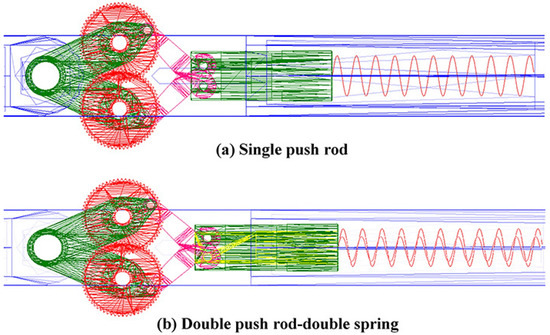 ADAMS simulation models of single push rod support adjustment mechanism, double push rod−double spring support adjustment mechanism.