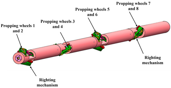 The three-dimensional model of the WDR was established, as shown in Figure 5. In order to facilitate the study of obstacle surmounting performance, four support adjustment mechanisms were selected. Assuming that the front and rear mechanisms are the righting mechanisms, only the obstacle surmounting performance of the two mechanisms in the middle was studied. According to the connection mode of the tractor at home and abroad, the mechanisms were distributed in a 90° rule. The propping wheels were named propping wheels 1 and 2, propping wheels 3 and 4, propping wheels 5 and 6, and propping wheels 7 and 8 from left to right, as shown in Figure 5. For the accuracy of simulation, the dimensions of the model were not scaled. Meanwhile, the dimensions were consistent with the designed WDR. Fixedly connecting bodies in the simulation model were combined by Boolean operations [20], and the remaining parts were considered as individual members. 41 components of the simulation model of the WDR were renamed and material attributes were defined. As the WDR was the rigid mechanism, the WDR was designed as the steel attribute.
