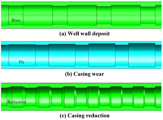 The obstacles of the casing pipe are generally divided into well wall deposit, casing wear and casing reduction. This paper took the casing with a 150 mm inner diameter as the study object. In order to facilitate the simulation study, well wall deposit in the casing pipe was simulated with rectangular bosses with step heights of 3 mm, 6 mm, 9 mm, and 12 mm, and the length of 50 mm. Casing wear was simulated with pits with depths of 3 mm, 6 mm, 9 mm, and 12 mm, and the length of 100 mm. And casing reduction was simulated with inclination angles with 9 mm in height, 10°, 15°, 20°, 25°, 30°, 35°, and 40° in inclination angles, and 20 mm in length. The models are shown in Figure 6.