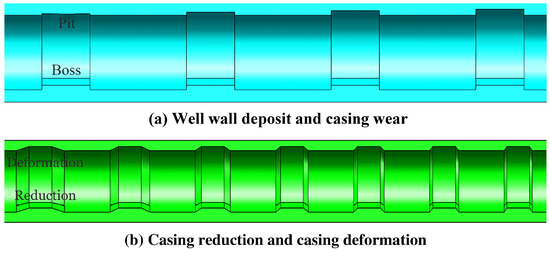Simulated well wall deposit and casing wear, casing reduction and casing deformation.