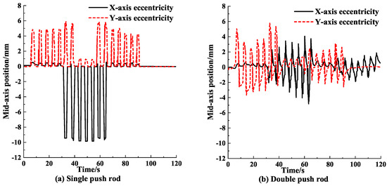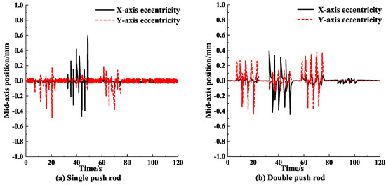 The displacement of the mid−axis of the single push rod support adjustment mechanism, double push rod−double spring support adjustment mechanism under well wall deposit obstacle.