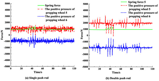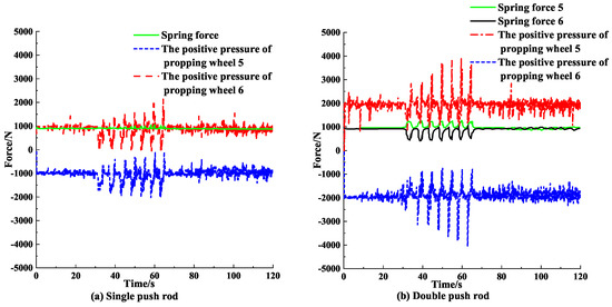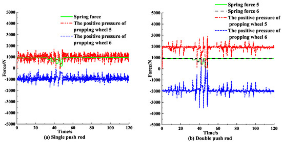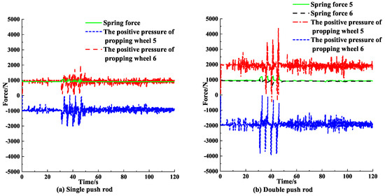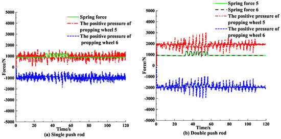 Under the action of the single push rod, two positive pressures of the propping wheels 5 and 6 fluctuated continuously under the acting force of 1000 N. Since the positive pressures of the two propping wheels were regulated with one spring, the positive pressure applied to the WDR can only be guaranteed at the expense of part of the centring performance. For the DPRDSSAM, the springs regulated the corresponding propping wheels respectively. And the propping wheels did not affect each other. Therefore, the positive pressure of the propping wheels continuously fluctuated under the acting force of 2000 N. The structure can ensure both the centring performance of the WDR and the effect of applying positive pressure to the propping wheel. The fluctuation of the positive pressure of the propping wheels 5 and 6 of the DPRDSSAM changed significantly. Thus the positive pressure is more sensitive to the spring force and the changing state of the tractor. The result indicates that the size of the positive pressure can be adjusted timely according to the motion state of the tractor, thus avoiding the phenomenon of lagging in the adjustment of the SPRSAM, and improving the obstacle surmounting performance of the tractor.