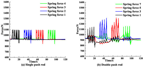 Figure 18a shows that the spring force in the WDR with the SPRSAM changed four times, with four-wave crests with equal heights. Figure 19a shows that the spring force in the WDR with the SPRSAM changed four times, with seven gradually elevated wave crests for each time. The states just correspond to the situation that the four pairs of the propping wheels crossed the four well wall deposits (with equal heights) and seven gradually increasing casing reductions. For the obstacles caused by casing wear and casing reduction, the adjustment spring can not be adjusted. Under the action of the centring guide, if the tractor keeps centred forcibly, which makes the propping wheels that crossing casing wear keeps in the suspended state, resulting in the incapability of providing tractive force. Figure 18b and Figure 19b show that changes in the spring force of the DPRDSSAM just corresponded to changes that the four propping wheels crossed the obstacles. The result indicates that the propping wheels can still keep in contact with the borehole wall under multiple obstacles and provide the tractive force required for the tractor. Upon comparison, the spring force of the DPRDSSAM fluctuated more greatly and the fluctuation was more complex. This is because the tractor crosses the obstacles, and the DPRDSSAM is more sensitive in response and quicker in feedback. And when the tractor crosses complex obstacles, the motion status of the tractor can be fed back more quickly. The action of the springs can be regulated timely so that the positive pressure between the propping wheels and the casing pipe can be adjusted timely according to the motion status of the tractor.