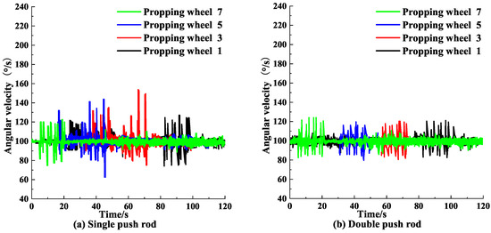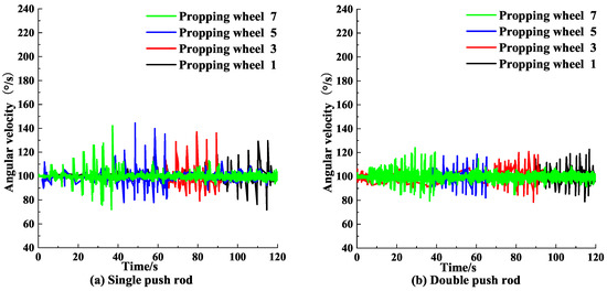 The change of the angular velocity of the support wheel of the single push rod support adjustment mechanism, double push rod−double spring support adjustment mechanism when crossing the casing reduction and casing deformation.