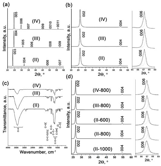 Figure 1. (a) XRD patterns of GIC−H2SO4 of II, III, IV stage; (b) XRD patterns and (c) FTIR spectra of expandable graphite based on GIC of IV, III, II stages; (d) XRD patterns of compressed EG.