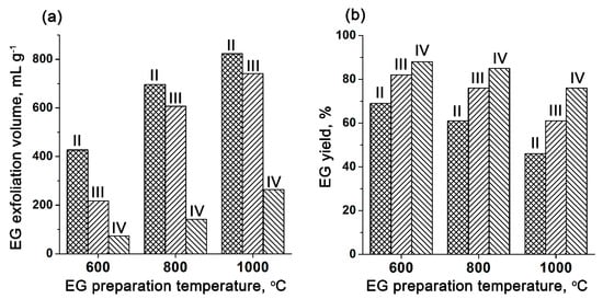 On the other side, an increase in the EG preparation temperature leads to oxidation of forming exfoliated graphite and a decrease of EG yield (YEG, %) (Figure 3b). The higher temperature promotes the rate of oxidation of the graphite matrix during exfoliation. Thus, the EG obtained at 1000 °C is characterized by less yield in comparison with lower temperatures.